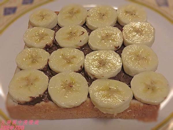↑先把可可醬抹在吐司上,再把切片香蕉擺上去就完成了“豪華香蕉榛果可可吐司”,我硬是把整根香蕉都用完,就成了毫無空隙的這副模樣囉XD。假日的早餐整個大升級!配上熱拿鐵有法國的fu~