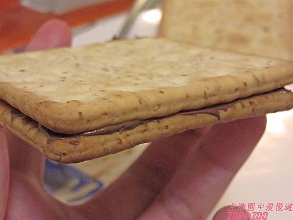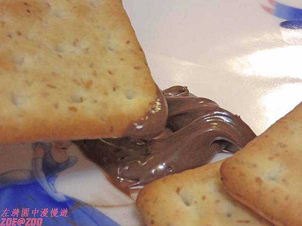 ↑哎呀~其實是換湯不換藥的榛果可可夾心式甜點啦!法國餅換成了蘇打餅乾,又有另番滋味。建議不要使用鹹度明顯、味道過重的蘇打餅乾,不然兩個味道正面衝突,就吃不出來榛果可可醬的美味了。