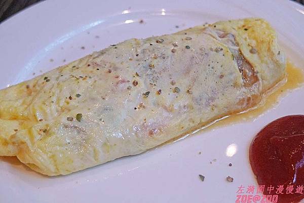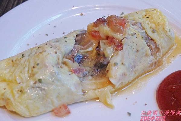 ↑這是我點的蛋捲。蛋皮很薄,我比較喜歡黃澄澄軟綿綿,切開會流蛋汁的歐姆蛋,所以對這有點小失望,但蛋捲裡面配料很多,有番茄和香菇,還算實在。