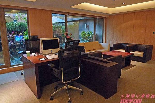 ↑商務中心一角。除了電腦之外,有一個沙發區,落地窗外是翠綠的陽台小花園。