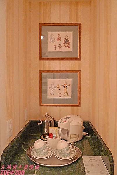 ↑茶水區。小小空間的牆壁上裝飾著美女與野獸中的故事人物草圖。