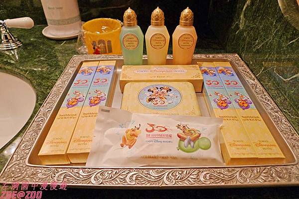 ↑盥洗用品上也都印有迪士尼卡通人物,而且你看到這鐵盤上的東西都是可以自由帶走的。但別興奮得太早啦!大多只是外盒上的圖案,裡面都是樸素的單色沒有任何迪士尼的標記,個人是覺得只有化妝棉、棉花棒盒和小漱口杯是直接印上圖案的,比較具有紀念價值。而且我們入住的時候剛好遇到東京迪士尼樂園的30周年紀念,這些東西都印有30周年紀念的圖案,這期間僅有的特別感,感覺意義更加重大。