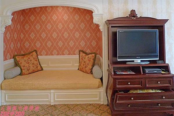 ↑凹式床的旁邊就是電視櫃。電視櫃很像美女與野獸的劇情裡會出現的櫃子管家。
