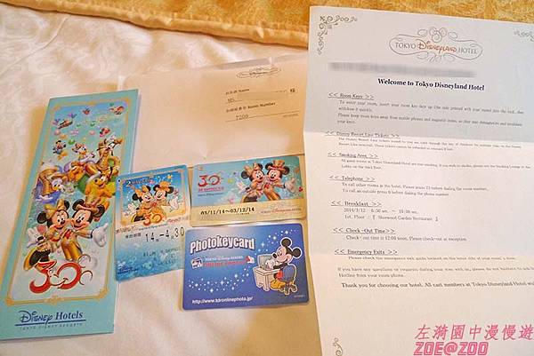 ↑入住的時候,飯店會給每個人一個信封袋,裡面是飯店的介紹,還有飯店的特別服務說明。入住迪士尼官方飯店的最大好處之一是,可以於樂園開園前15鐘入場,有去過迪士尼樂園的人應該知道,提前入場有多麼珍貴!!可以先去搶排最熱門的遊樂設施,或是去搶排快速通關取票口。另外,最重要的是,我建議大家退房時房門卡要記得帶走!這個卡飯店不會回收,而且那上面有住宿客的個人名字和住宿日期,非常具有紀念價值喔!看到卡片上自己的名字,還真有種虛榮感耶(我要裱起來保存)