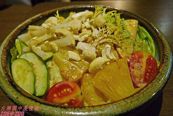 ↑胡麻和風沙拉,一份140元。看!是不是賣相不錯啊!有少見的鳳梨外,還有腰果呢!胡麻和風醬和水果沙拉真的很搭!在吃了一堆可能會引發火氣大的串燒、燒烤後,是平衡口感的good choice。