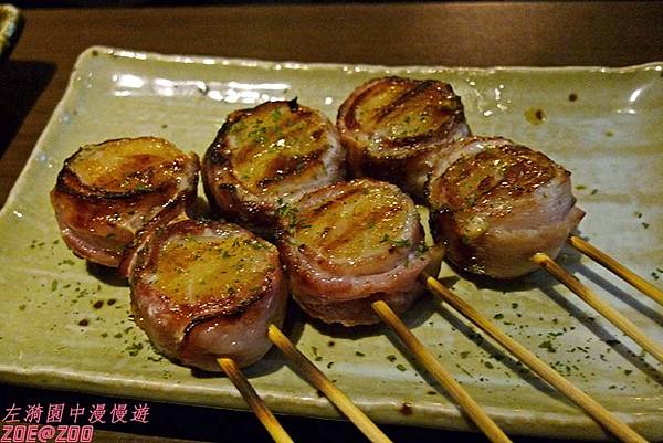 ↑培根捲鮮干貝,兩串260元, 雖是高貴的食材,但烤起來容易顯得無味太乾的鮮干貝搭配味重的培根,培根的鹹味與油質讓沒有太多調味的干貝更加好吃。這道和接下來介紹的「鹽烤無骨牛小排」都是店家的推薦串燒喔,果然不負眾望喔!