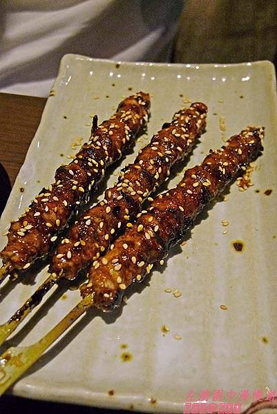 ↑醬燒雞頸肉串,兩串100元。當天的唯一醬燒口味串燒,灑滿了芝麻。