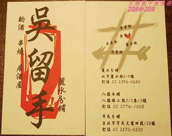 和多年不見的老同事聚餐,老同事告知聚餐地點選在「吳留手」。不知為何左漪從頭到尾就一直以為這是間中式或台式料理店!可能是賣紅油炒手的名店「吳炒手」從小聽到大已經先入為主,也可能是「吳留手」聽起來頗像武俠劇內大內高手的名字,總之腦子裡就是不會把這家店跟日式串燒居酒屋連結在一起。聚餐當天,我按著朋友Line給我的地址,從信義路口走入麗水街,沿街搜尋這家店,我都在注意是否有中式裝潢的店家或是中式慣有的紅色招牌,走了一段路,經過了幾間漂亮的店,都還沒看到寫著吳留手的招牌,開始懷疑起眼前轉角的小麵店會不會就是今天聚餐的地點,心裡納悶朋友怎麼會選在這樣的地方呢?(個人不是對小麵店有意見喔!只是小麵店適合聚餐聊天嗎?)偏偏小麵店的招牌和地址門牌又不明顯,我還在店家前仔細的觀察了一下,直到看到店內牆上菜單看板上寫的是別的店名,才鬆了一口氣,再耐著性子再往前繼續找。不久,一家仿日式建築風格的店映入眼簾,看起來很像是居酒屋,而高掛燈籠上居然就寫著「吳留手」耶!老同事說她可是一個月前就訂好了位子,要不然這裡可是一位難求的熱門居酒屋。我真是孤陋寡聞,不識泰山啊!