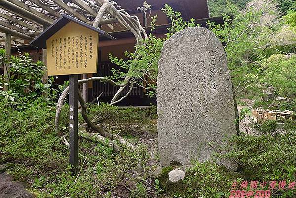 ↑矗立在門前的紀念碑與告示牌上,敘述著甘酒茶屋的由來。在江戶時代,經由箱根往返江戶(東京)的旅人,在即將抵達箱根關所前,會在這裡休憩,喝一杯甘酒稍稍慰藉旅途的疲累。這茶屋是當時頗具知名度的名店,還曾經出現在浮世繪當中呢!