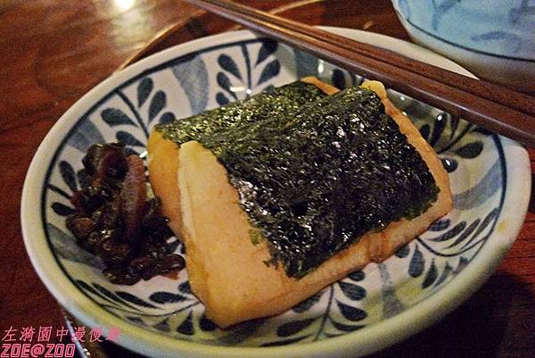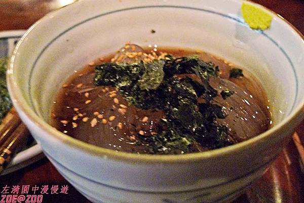 ↑ところ天(寒天,也有翻譯成涼粉),500日圓。這碗是左媽點的,她超愛寒天的,卻很少有機會吃到鹹口味的。滑Q的寒天浸在店家自製的醋醬中,上面點綴海苔和芝麻,還有山葵,就像是在吃涼麵一樣,只不過入口的是溜一下就滑入口的寒天。
