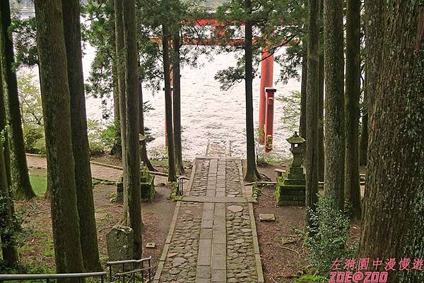 ↑沿著參道階梯往湖邊方向走一些,隱約就可看到箱根神社湖邊鳥居。
