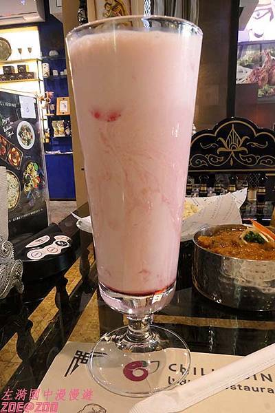 ↑印式玫瑰優格,110元。來印度餐廳,總要來一杯Lassi(印度優格),加了玫瑰醬的優格顏色很甜美。