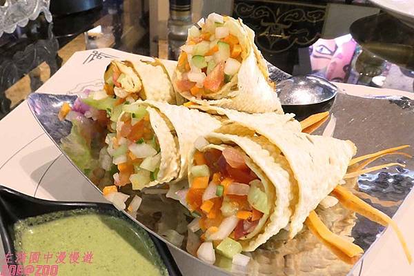 ↑瑪莎拉薄片捲,120元。薄片捲皮吃起來像鹹脆餅乾,自帶味道,可能光吃薄片捲皮也會一口接一口很涮嘴吧!搭配切碎的清爽鮮甜的時蔬,真的很對我的胃口,個人超愛! 店家有附綠色的醬料,但我幾乎都沒有沾就快吃光了。