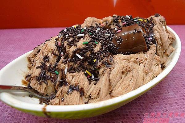 ↑黑森林巧克力冰磚,75元。巧克力味道的雪花冰吃起來也很不錯,淋上巧克力醬和巧克力,冰上還躺著一條ㄉㄨㄞ‧ㄉㄨㄞ的巧克力布丁,這也是個集巧克力大成之冰品!