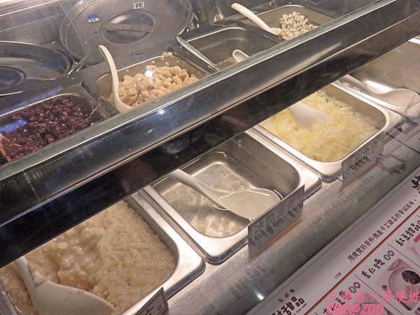 ↑當天有七、八種配料提供加選,加一樣要多加10元,多加一塊杏仁豆腐加15元。我點了杏仁豆腐冰,可以從這裡面選擇兩樣配料。(本文中所有餐點價格為2015年當時)