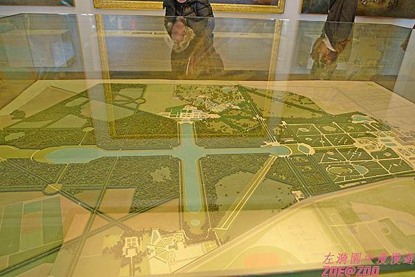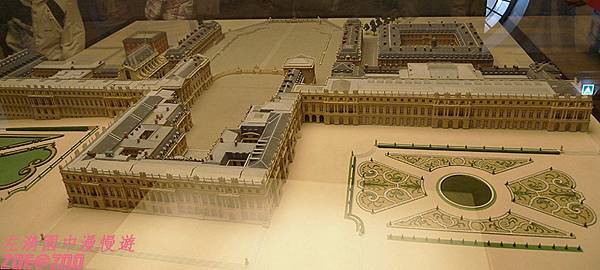 ↑凡爾賽宮殿建築部份的模型。非常有趣的是宮殿主建築離凡爾賽宮的前門入口處最近,雖然有高高也鑲著金邊的外牆圍繞,但一般人民從門口就可以遠遠觀望到宮殿,而廣大的庭園比較像是後花園,反而是隱密不可見的。這和中國的宮廷設計想法剛好徹底相反,中國皇帝的主宮殿是被保護得最好的,由各種城牆、大小側宮和花園層層包圍,隱蔽在最深處。果然東西方文化的差異,連皇室貴族的想法也天差地遠。