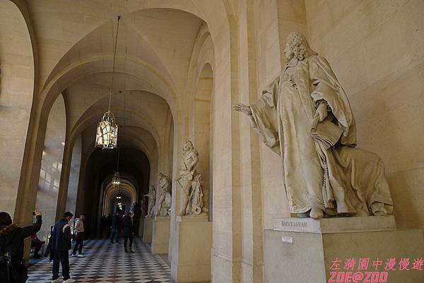 ↑宮殿二樓的迴廊。這裡算是整個凡爾賽宮內顏色最少,最“樸素”的空間,也沒有處處雕金,但是挑高的天花板是由一連串小型倒尖錐穹頂構成,仍很有氣勢。右邊陳列著重要人物的雕像,只怪我平時沒唸書,認識的沒幾個。