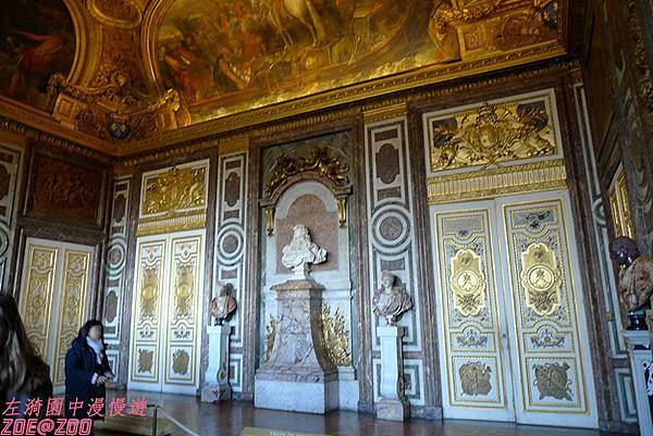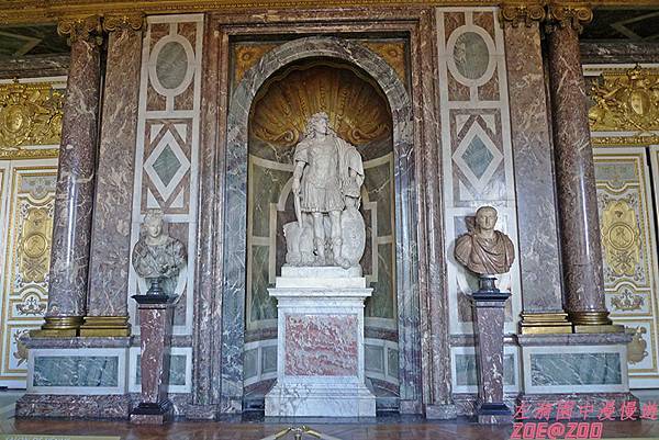 ↑海格力斯廳,注意到了嗎?這廳裡的柱子材質是花花的深色大理石,可能個人去過的歐洲國家不多,第一次看到這樣的建材被運用在宮殿中,覺得還蠻新鮮的。事實上深色大理石在凡爾宮內的各個大廳裡還蠻常見的,後來才得知大理石普遍被使用在巴洛克風格的建築當中。