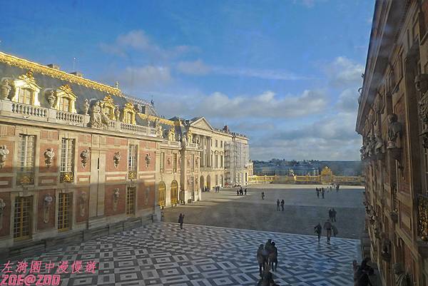 ↑這是從國王的寢宮窗戶拍出去的,剛好正對著凡爾賽宮殿的出入正門。因為路易十四號稱為太陽王,希望自己的床是朝著正東方的,就將自己的房間設在這個方位上。受中國文化影響極深的我忍不住想,這法國國王也真是太有自信的,這豈不是赤裸裸的讓自己睡在最危險的位置嗎?若當時有超級長射程步槍,說不定遠在大門外就可以瞄準路易十四呢!