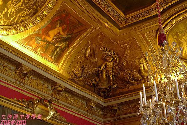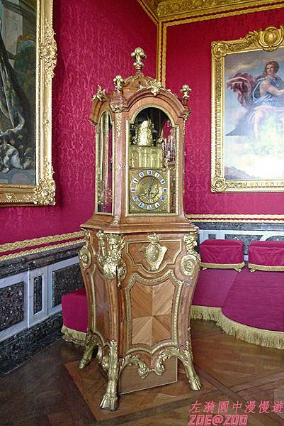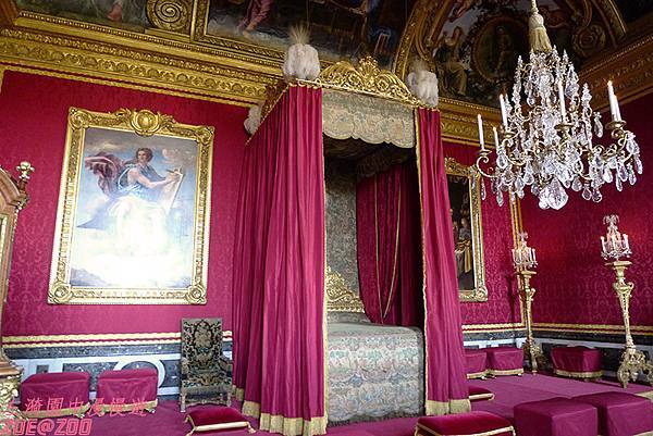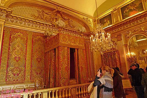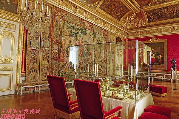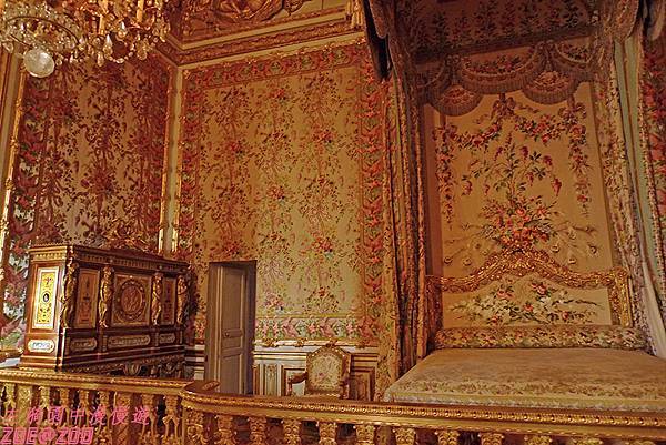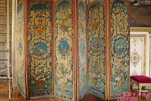 ↑王后的寢宮,碎花圖樣的精緻繡花充滿整個空間,充滿浪漫甜美的氣氛,非常女性化。在大革命發生前夕,暴動者闖入宮殿時,有凡爾賽拜金女稱號的瑪麗王后還睡在這裡,慌亂中從圖片左邊的小門逃出,才暫時逃過一劫。從語音導覽中得知,當時的王后要生小孩時,重要的大臣們會隨側在旁監看,確保小孩是皇室之子。雖說非常不重視女性隱私,但好像也可以理解大臣們的“用心良苦”。如果當時的中國皇朝也效倣這點的話,可能就可以預防“貍貓換太子”這樣的陰謀了。