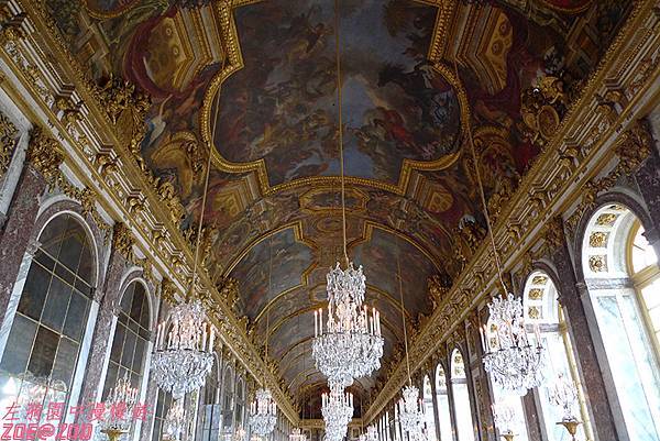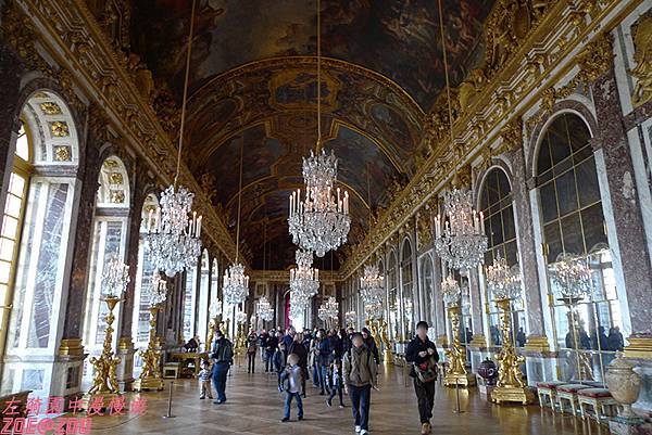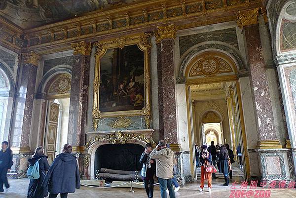 一邊是面向花園的拱型落地窗,一邊是和落地窗對稱的拱型拼接鏡子。極端講究對稱美的這奢華廊廳邊上也對稱的排列著金雕燈台。這裡是朝臣使節等待接見的地方,也是皇室豪華婚禮的場所。最後一場婚禮當然就是路易十六和瑪莉王后囉!在這裡舉行了盛大的婚禮化妝舞會。歷史聞名的凡爾賽條約也是在這裡簽訂的。