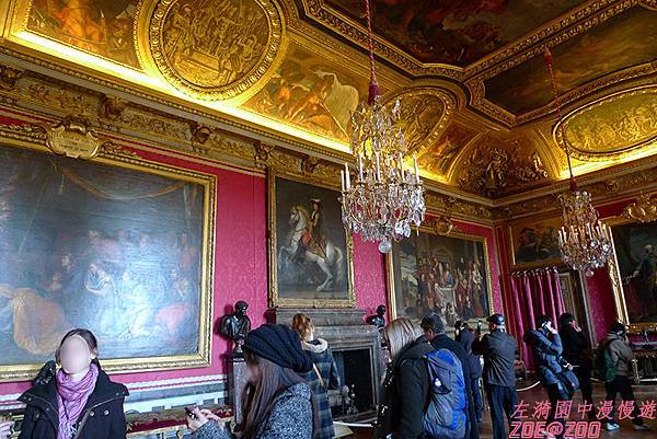 在地朋友小茱說,其實來凡爾賽宮也需要靠運氣,因為宮殿常常整修,每次開放的展示間都不太一樣,她有個朋友就運氣超差,遠從台灣來,好幾個著名的廳堂卻都沒能參觀到。此次看到了最被大家所讚揚驚嘆的大鏡廊,國王、王后的寢室也都有幸能拜見到,雖然有點遺憾沒看到戰爭廊、豐收廳等,但也很令人慶幸的了(超容易滿足XD)。除了宮殿建築本身是巴洛克風格的最終極傑作,構造雄偉、壁畫壯麗、浮雕細緻,非常有看頭外,裡面的裝飾品、畫作也很值得觀賞。雖然參觀人潮洶湧,但是放慢腳步,讓思緒隨語音導覽帶動,站在這歷史豪華巨作,金碧輝煌的華美宮殿裡,彷彿能感受到那絢麗年代的歌舞昇平到革命變動的不堪。
