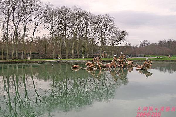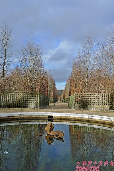 腹地極度寬廣的凡爾賽庭園,在講究對稱美的設計下,依著中線的長長運河,工整有秩序的雙雙延伸開來,站在庭園最前端的正中間望過去,眼前雖沒有任何障礙物擋住視線,卻看不到界線盡頭。水池兩旁的枯樹林,讓冬天的庭園有著濃濃的蕭瑟感,加上法國冬天日照時間極短,陰陰的天空下更顯孤寂。可能怕下雪破壞,庭園內的露天雕刻很多還被整個包覆的緊緊的。還好冬天的庭園參觀費全免,才不會覺得虧大了啊,在夏天的大噴水季時,可是要另外收費。不過我還是很期待能有機會夏季再來欣賞百花繽紛、水聲潺潺,充滿活力的庭園。這庭園深處還分別有大特里農依宮和瑪麗王后的特宮苑,本來我們有想要去看看的,卻迷路在枯樹林中,走累的我們最後只好放棄,讓我對凡爾賽庭園又增添了一些留戀…