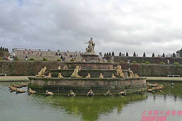 ↑拉朵娜大噴泉,取材自希臘神話,頂端是美麗的女神拉朵娜和愛子阿波羅,下面卻環繞著幾層張嘴的青蛙、蜥蜴,被神處罰的痛苦村民…其實看起來有點噁心,不是很賞心悅目的主題雕刻啊。據說是路易十四想要藉此宣示王室地位的不可動搖以及不可被忤逆。
