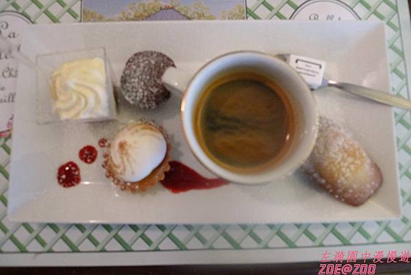 ↑Café gourmand(咖啡+甜點拼盤),8歐元。和我一樣愛吃甜食的朋友小茱介紹的,Café gourmand有點像甜點套餐的感覺,在法國很多餐廳裡都有提供,只是每家店配套的甜點都不一樣。La Flottille的甜點還好而已,並沒有讓人驚喜。咖啡非常的苦啊~ >_<