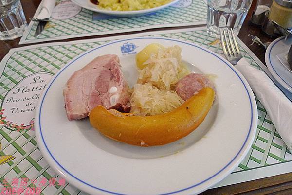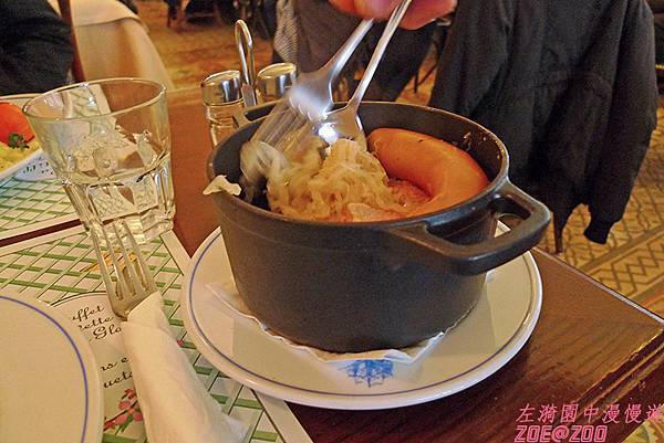 ↑Choucroute Alsacicnne Maison(阿爾薩斯風酸菜燉肉),14歐元。整鍋送上桌後,服務人員再把鍋蓋打開,把酸菜燉肉放到盤子裡。一打開鍋蓋就聞到濃濃的酸菜味。這道料理,左漪到發源地東法阿爾薩斯省的史特拉斯堡時也有吃,那時是裝呈在餐盤上的,我覺得有鍋還是比較有感覺耶。(本文中的餐點價格為2012年當時)