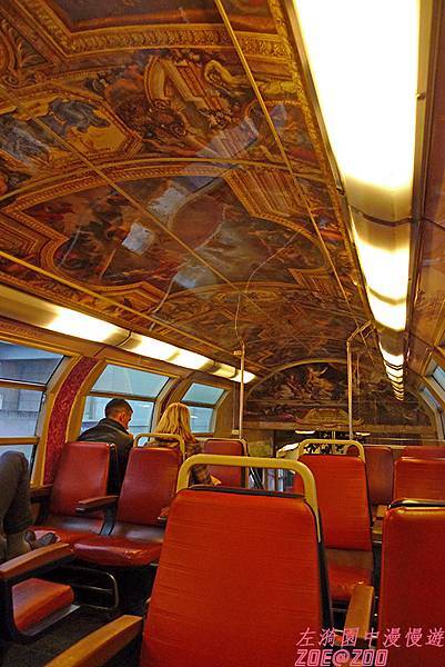 ↑我搭乘到的國鐵列車,車廂的天花板上有仿造宮廷壁畫的裝飾,超級有fu~,加上座椅又是紅色的,在火車上就已經有凡爾賽的氣氛了。我的在地朋友小茱來凡爾賽宮好多次了,也很驚喜第一次坐到這樣的車廂,看來不是每台前往凡爾賽宮的列車都有這樣的設計,所以能夠坐到,就覺得自己好幸運啊!