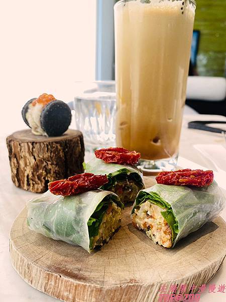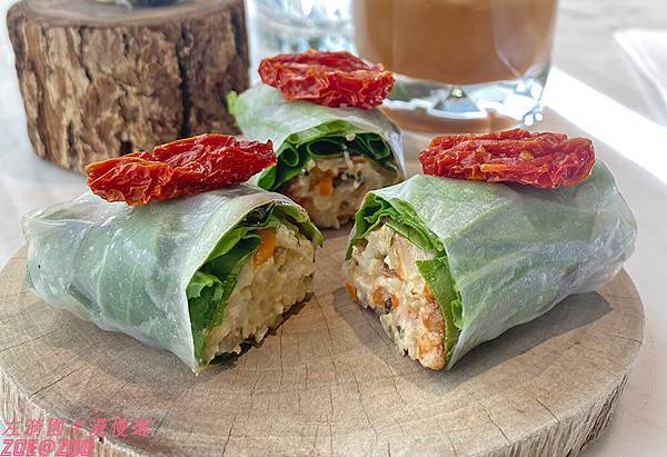 ↑法式蝦鬆捲,100元。外觀很像越南生春捲,生菜裡除了蝦鬆還有荸薺,增添脆度,搭配略酸的義式番茄乾,非常爽口。個人很喜歡!一塊一口大小,三口就完食了。