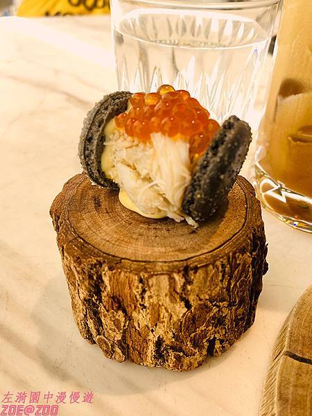 一顆90元,一口小尺寸,拿起時很怕四分五裂,小心翼翼地拿起來一口吃掉。美乃滋蟹肉鮭魚卵的味道十足,黑胡椒馬卡龍的口感稍硬,比較像餅乾。