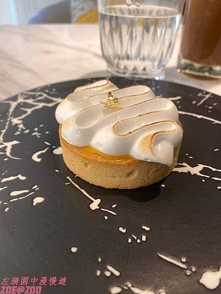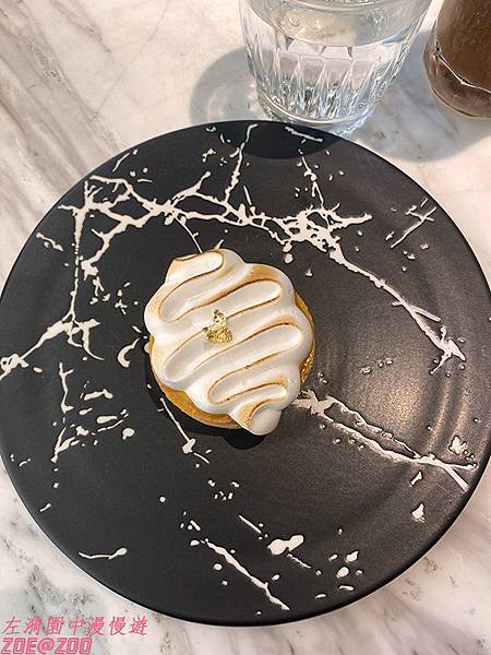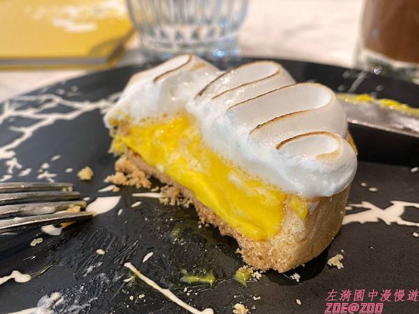 ↑期待的甜點上桌了。檸檬塔,160元。雖非現點現做的盤式甜點,只是擺在這盤子上也是很美。